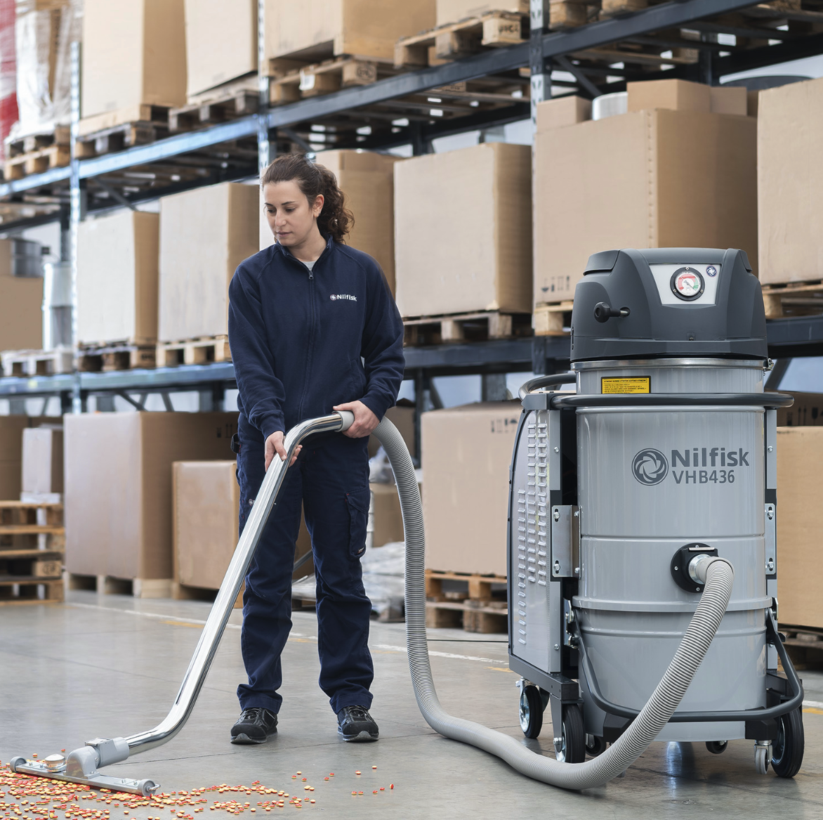 Mit dem neuen VHB436 komplettiert Nilfisk sein umfangreiches Sortiment an Reinigungsgeräten für Lager und Logistik. Holzspäne, Kunststoffreste, gefährliche Stäube, kleine Etiketten oder sogar geringe Mengen an Flüssigkeit – der batteriebetriebene Industriesauger lässt unterschiedlichste Verschmutzungen in Lager- und Produktionshallen im Nu in seinem 50 oder 100 Liter fassenden Behälter verschwinden. Dabei stellen schwer zugängliche Bereiche, wie etwa zwischen Paletten oder oberhalb von Regalen, kein Hindernis für ihn dar. Im Gegenteil: Mit Leichtigkeit saugt die Neuheit sogar bis unter die Decke oder entlang von Außenfassaden, denn eine Überkopfreinigung ist aufgrund des passenden optionalen Zubehörs auch ohne Leiter kein Problem. Für nicht einsehbare Bereiche steht zusätzlich ein Set samt Kamera und Display zur Verfügung.