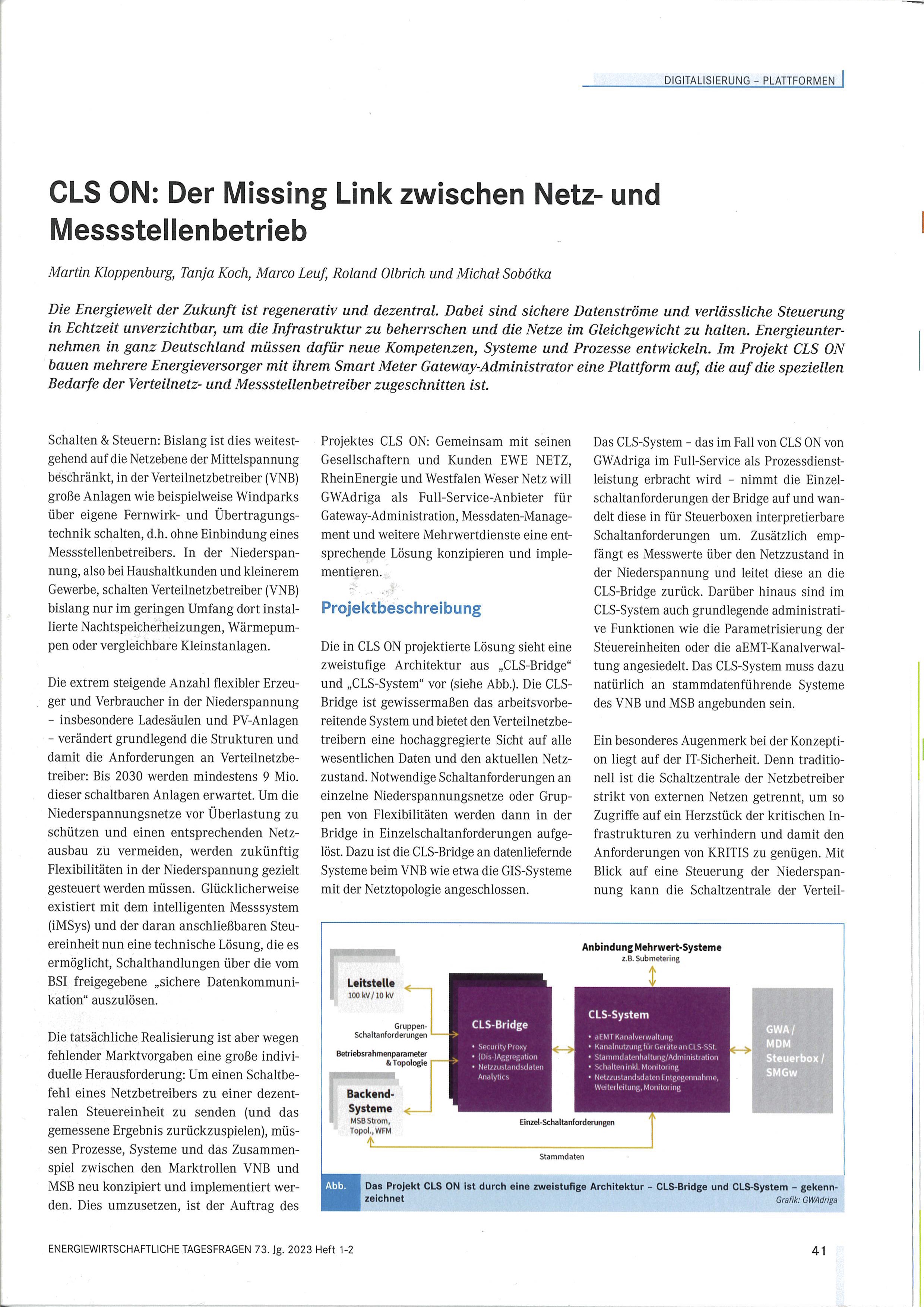 Die Energiewelt der Zukunft ist regenerativ und dezentral. Dabei sind sichere Datenströme und verlässliche Steuerung in Echtzeit unverzichtbar, um die Infrastruktur zu beherrschen und die Netze im Gleichgewicht zu halten. Energieunternehmen in ganz Deutschland müssen dafür neue Kompetenzen, Systeme und Prozesse aufbauen. In einem gemeinsamen Projekt bauen EWE NETZ, RheinEnergie AG und Westfalen Weser Netz mit ihrem Smart Meter Gateway-Administrator GWAdriga mit CLS ON eine Plattform auf, die auf die speziellen Bedarfe der Verteilnetz- und Messtellenbetreiber zugeschnitten ist.