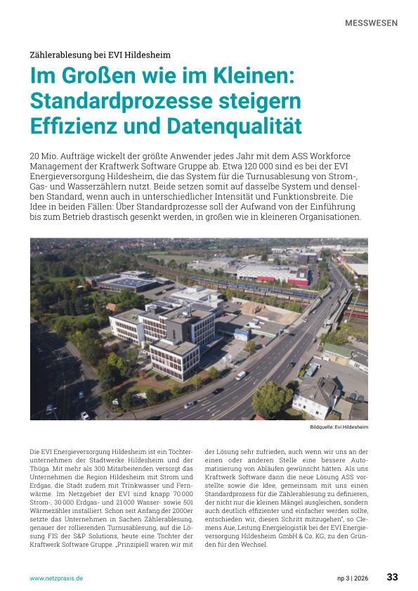 20 Mio. Aufträge wickelt der größte Anwender jedes Jahr mit dem ASS Workforce Management der Kraftwerk Software Gruppe ab. Etwa 120 000 sind es bei der EVI Energieversorgung Hildesheim, die das System für die Turnusablesung von Strom-, Gas- und Wasserzählern nutzt. Beide setzen somit auf dasselbe System und denselben Standard, wenn auch in unterschiedlicher Intensität und Funktionsbreite. Die Idee in beiden Fällen: Über Standardprozesse soll der Aufwand von der Einführung bis zum Betrieb drastisch gesenkt werden, in großen wie in kleineren Organisationen.