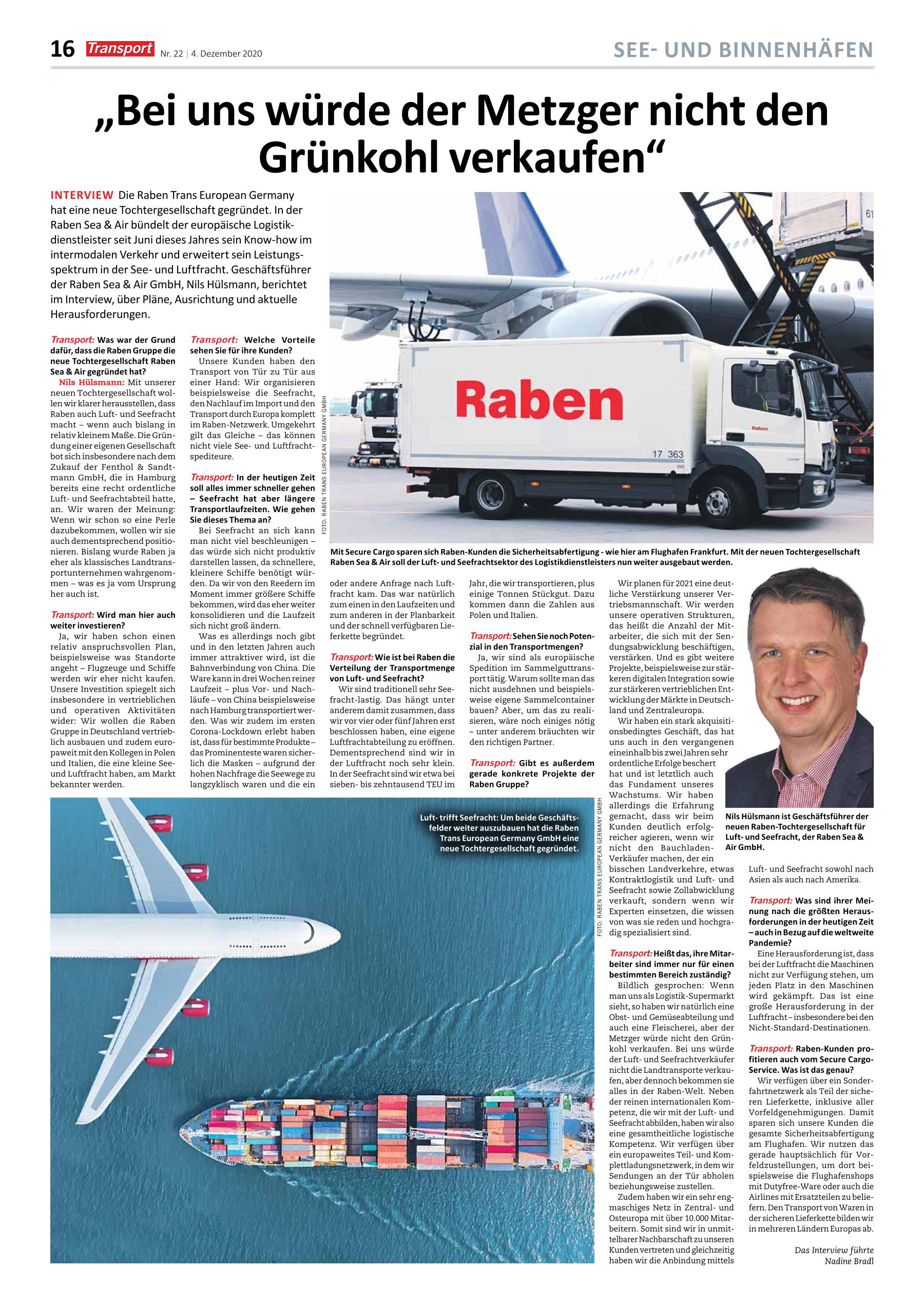 Unser Kunde Raben hat mit Raben Sea&Air eine neue Tochtergesellschaft gegründet. Hier bündelt der Logistikdienstleister seine Luftfracht und Seefracht-Kompetenzen. Im Interview mit der Zeitung "Transport" berichtet Sea&Air-Geschäftsführer Nils Hülsmann über Pläne, Ausrichtung und die aktuellen Herausforderungen der Tochtergesellschaft.