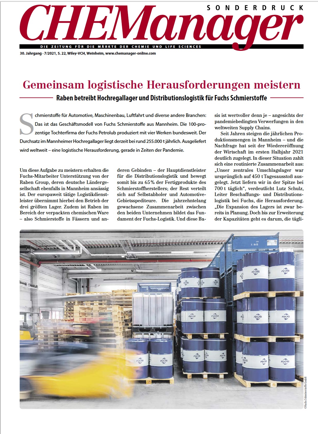 Schmierstoffe für Automotive, Maschinenbau, Luftfahrt und diverse andere Branchen: Das ist das Geschäftsmodell von Fuchs Schmierstoffe aus Mannheim.Die 100-prozentige Tochterfirma der Fuchs Petrolub produziert mit vier Werken bundesweit. Der Durchsatz im Mannheimer Hochregallager liegt derzeit bei rund 255.000 t jährlich. Ausgeliefert wird weltweit – eine logistische Herausforderung, gerade in Zeiten der Pandemie. Um diese Aufgabe zu meistern erhalten die Fuchs-Mitarbeiter Unterstützung von der Raben Group, deren deutsche Ländergesellschaft ebenfalls in Mannheim ansässig ist. Die jahrzehntelang gewachsene Zusammenarbeit zwischen den beiden Unternehmen bildet das Fundament der Fuchs-Logistik. Und diese Basis ist wertvoller denn je – angesichts der pandemiebedingten Verwerfungen in den weltweiten Supply Chains.
