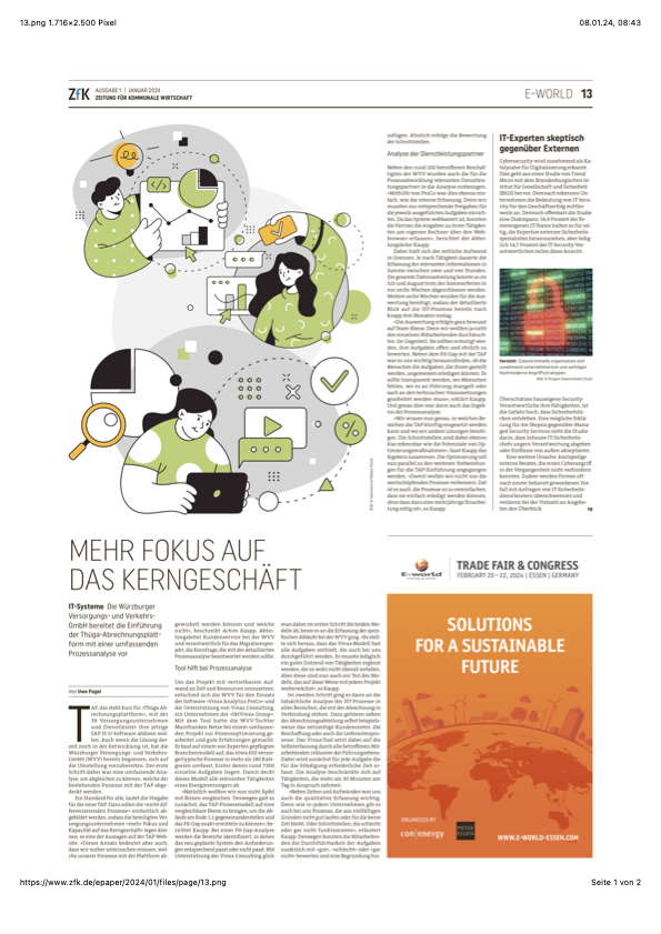 „TAP“, das steht kurz für „Thüga Abrechnungsplattform“, mit der 39 Versorgungsunternehmen und Dienstleister ihre jetzige SAP IS-U-Software ablösen wollen. Auch wenn die Lösung derzeit noch in Entwicklung ist, hat die Würzburger Versorgungs- und Verkehrs-GmbH (WVV) bereits begonnen, sich auf die Umstellung vorzubereiten. Der erste Schritt dabei war eine umfassende Analyse, um abgleichen zu können, welche der bestehenden Prozesse mit der TAP abgedeckt werden. Mit Unterstützung der Vivax Consulting, einem Unternehmen der tktVivax Group, und dem Prozessanalyse-Tool Vivax Analytics ProCo wurde diese in weniger als drei Monaten abgeschlossen.