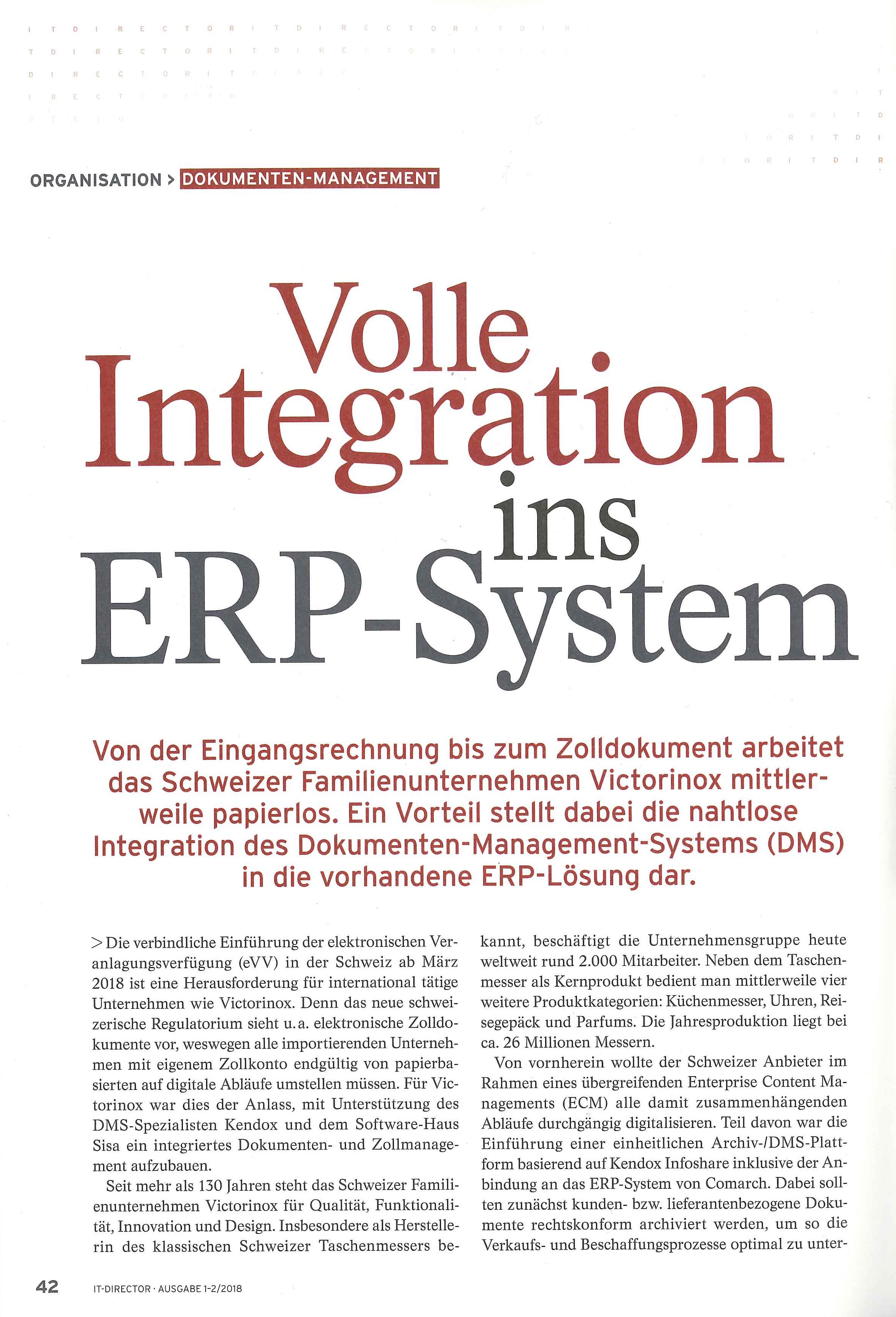 Die verbindliche Einführung der elektronischen Veranlagungsverfügung (eVV) in der Schweiz ab März 2018 ist eine Herausforderung für international tätige Unternehmen wie Victorinox. Denn das neue schweizerische Regulatorium sieht unter anderem elektronische Zolldokumente vor, weswegen alle importierenden Unternehmen mit eigenem Zollkonto endgültig von papierbasierten auf digitale Abläufe umstellen müssen. Für Victorinox war dies der Anlass, mit Unterstützung des DMS-Spezialisten Kendox und dem Softwarehaus SISA ein integriertes Dokumenten- und Zoll-Management aufzubauen.