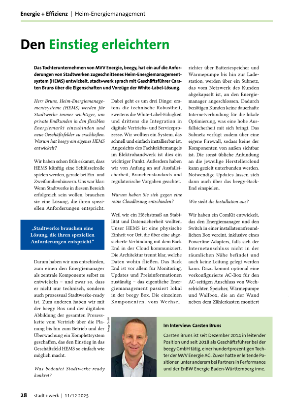 Das Tochterunternehmen von MVV Energie, beegy, hat ein auf die Anforderungen von Stadtwerken zugeschnittenes Heim-Energiemanagementsystem (HEMS) entwickelt. stadt+werk sprach mit Geschäftsführer Carsten Bruns über die Eigenschaften und Vorzüge der White-Label-Lösung.