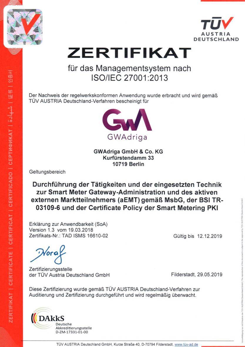 Der Berliner Full-Service-Anbieter für Smart-Meter-Gateway-Administration hat jetzt auch die erweiterte Zertifizierung für die Durchführung des CLS-Betriebs erhalten. Damit gehört GWAdriga zu den ersten Dienstleistern, die „das Management des aktiven externen Marktteilnehmers (aEMT) gemäß MsBG, der BSI TR-03109-6 und der Certificate Policy der Smart Metering PKI" offiziell anbieten dürfen, so das Zertifikat im Wortlaut. Um das Audit des TÜV Austria zu bestehen, mussten die mit dem CLS-Management (Controllable Local Systems) verbundenen Geschäftsprozesse angepasst und dokumentiert werden. Die Umsetzung wurde anschließend im Rahmen eines Audits vor Ort überprüft. „Das CLS-Management wird künftig zur Schlüsselfunktion, wenn es um dezentrale Flexibilitäten wie schaltbare Lasten, Erzeugungsanlagen und Speicher geht. Für uns wird dies neben der eigentlichen Gateway-Administration ein ganz zentrales Geschäftsfeld werden. Mit der Zertifizierung haben wir nun auch eine ganz wichtige Voraussetzung, um die begonnenen CLS-Pilotprojekte bald ausweiten zu können.", erklärt Dr. Michał Sobótka, einer der beiden GWAdriga-Geschäftsführer.