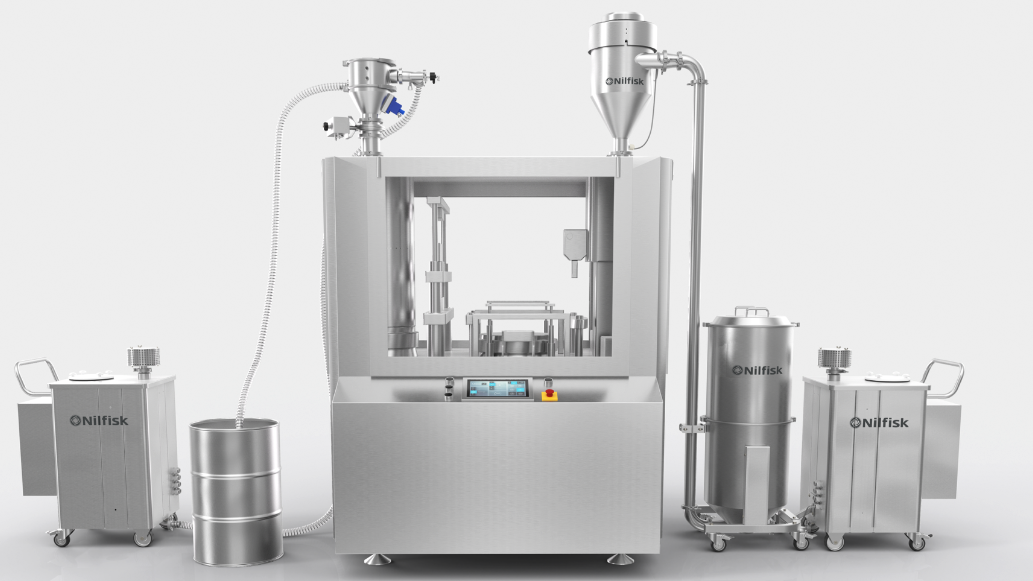 Mit der neuen 3er-Serie an automatisierten Produktfördersystemen bündelt Nilfisk seine über 30-jährige Fachexpertise mit bedürfnisorientierter Innovationskraft. Im Zentrum steht das neue Modell 3VP, welches sich durch sein modulares GMP-Design vollkommen nahtlos in jede Produktionsumgebung einfügt. Mit einer Förderleistung von bis zu 550 Kilogramm in der Stunde beschickt der druckluftbetriebene Produktförderer Prozessmaschinen (Kapselfüllmaschinen oder Tablettenpressen) mit Pulvern und Granulaten. Das implementierte Pfropfenförderverfahren stellt sicher, dass die Gemischbestandteile trotz unterschiedlicher Schweren bzw. Dichten nicht getrennt werden und die Konzentration der Komponenten konstant bleibt. Die hervorragende Filtrationsleistung des PTFE-M-Klasse-Hauptfilters sowie des HEPA-H14-Filterelements erlaubt den sicheren und hygienischen Umgang mit feinen Pulvern bis 0,2 μm, während effiziente Filterreinigungsverfahren den schnellen Materialwechsel gewährleisten. Dank der kompakten Maße von Trichter und Fahrgestell sowie des geringen Gewichts von maximal 17 Kilogramm ist die Installation auch bei sehr beengten Platzverhältnissen problemlos möglich.