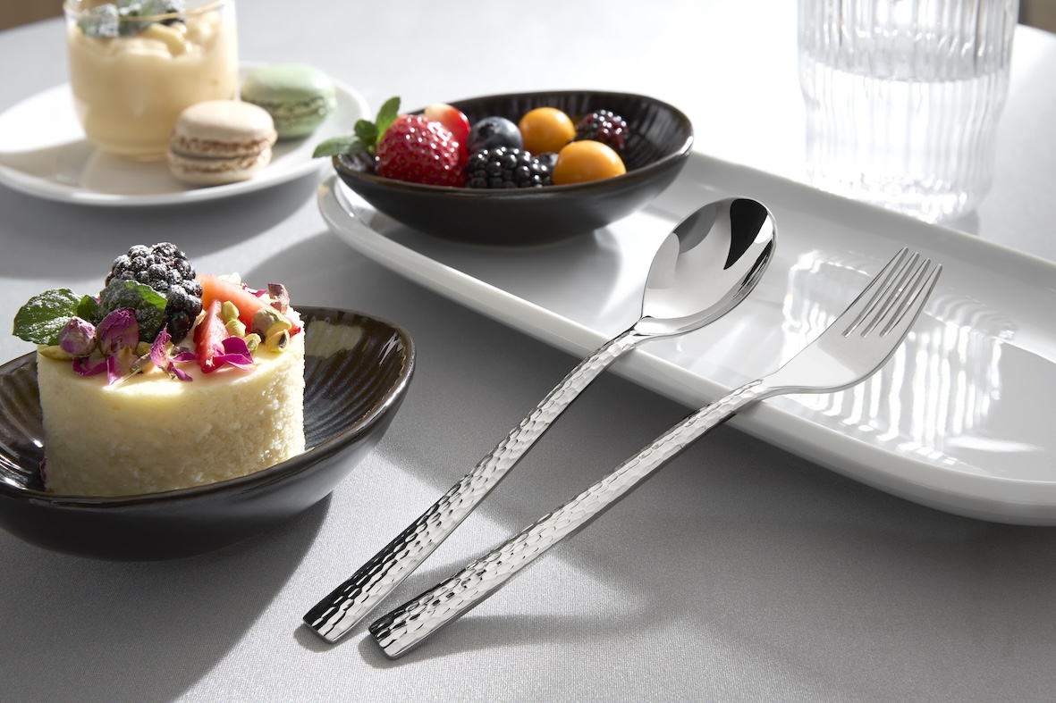 Event gastronomy is constantly evolving, but one topic remains constant: the aspiration to make flying buffets or catering more sustainable. WMF Professional captures this trend with the inMotion cutlery collection. The series comprises four cutlery items: spoon, fork and knife as well as a food picker. Despite its well-balanced proportions and the rather restrained design, inMotion is a design highlight: The sloping shape at the transition from the handle to the prongs on the fork is just as impressive as the knife with a tapered tip. The hammered surface lends the cutlery an extraordinary character. What stands out most however, is the size. The individual cutlery pieces are significantly smaller compared to conventional collections and thus especially handy.