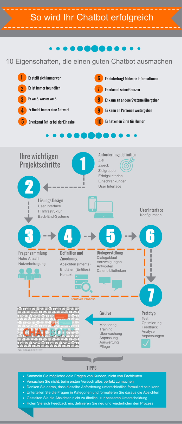 Um Chatbots erfolgreich zu entwickeln, einzuführen und zuverlässig zu betreiben, empfiehlt sich eine äußerst gründliche Konzeption. Denn mit der technischen Umsetzung allein ist es nicht getan. Simone Schubert: „Unabdingbare Voraussetzung ist eine Projektierung, die folgende Punkte beachtet: Anforderungen, Lösungs-Design, Fragensammlung, Definition und Zuordnung, Dialogerstellung, User Interface, Prototyp und schließlich das Go Live."