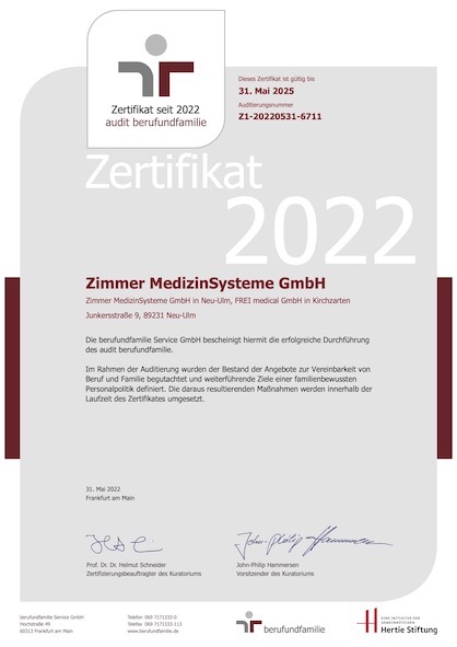 Das Kuratorium berufundfamilie hat Zimmer MedizinSysteme GmbH für die unternehmensinterne, strategische Vereinbarkeitspolitik ausgezeichnet. Der Experte für medizinische Systemlösungen aus dem süddeutschen Neu-Ulm hat hierfür ein Auditierungsverfahren durchlaufen und individuelle Zielvereinbarungen getroffen, um die Vereinbarkeit von Beruf, Familie und Privatleben nachhaltig zu gestalten. „Dass Arbeit und Privatleben bei unseren Mitarbeitern im Einklang sind, war schon immer Teil unserer Unternehmenskultur. Nun haben wir jedoch eine Zielvereinbarung aus den strategischen Zielen und konkret definierten Maßnahmen festgehalten", erklärt Geschäftsführer Armin Zimmer. So werden die Mitarbeiter schon seit Jahren finanziell am Erfolg des Unternehmens beteiligt, können ihre Arbeitszeit flexibel gestalten und auch die Gesundheit wird bei Zimmer großgeschrieben: Job-Bike, täglich frisches Obst oder bei Bedarf Massagen am Arbeitsplatz tragen zum guten Unternehmensklima bei – die Kompetenz zur Gesundheitsförderung liegt schließlich im Haus. Die Umsetzung dieser Vereinbarung wird während der dreijährigen Laufzeit des Zertifikats jährlich von der berufundfamilie GmbH überprüft. Die Ehrung der Zertifikatsträger fand am 21. Juni im Rahmen eines Online-Events statt.