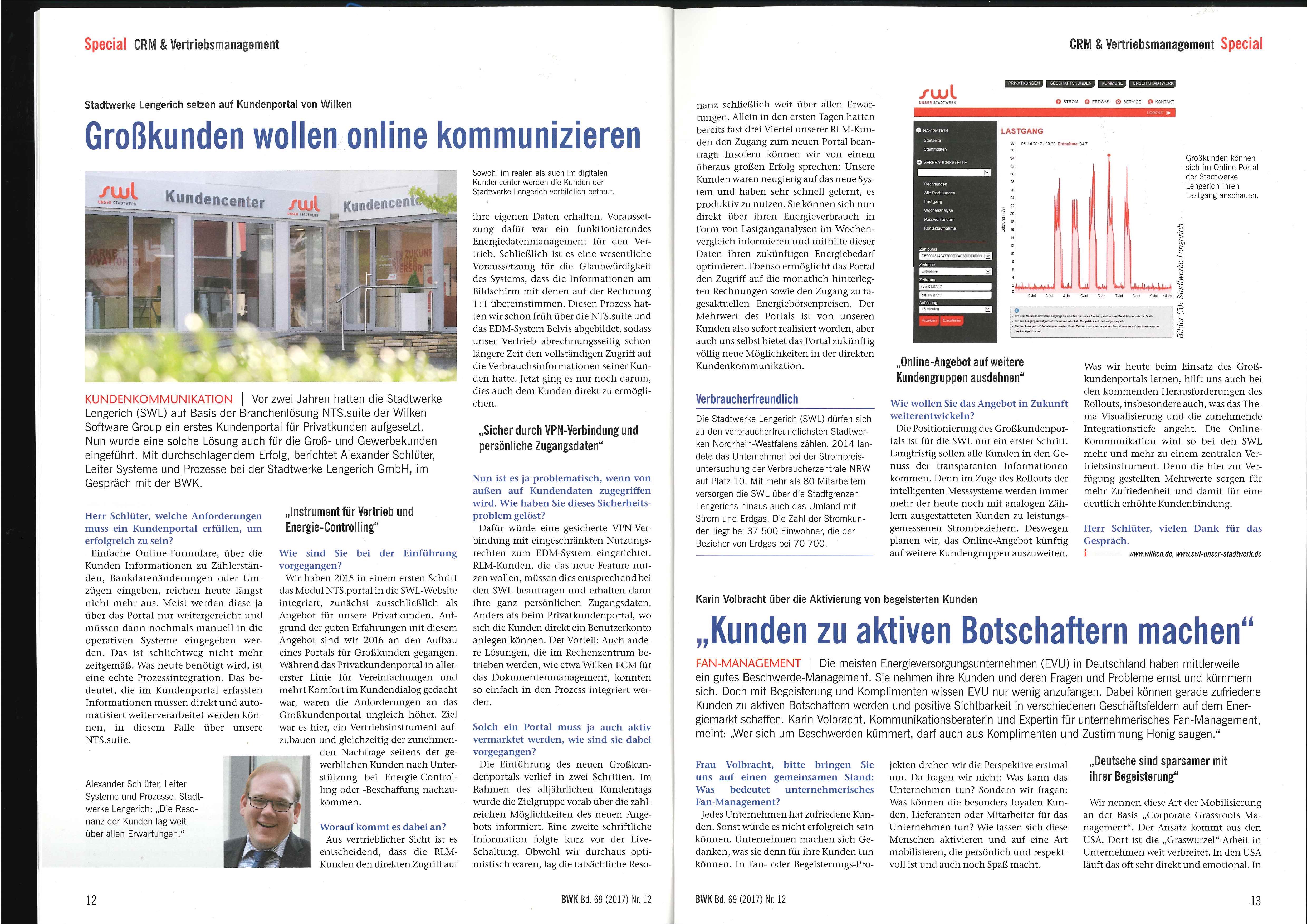 Schon vor zwei Jahren hatten die Stadtwerke Lengerich (SWL) auf Basis der Branchenlösung NTS.suite der Wilken Software Group ein erstes Kundenportal für die Privatkunden aufgesetzt. Nun wurde eine solche Lösung auch für die Groß- und Gewerbekunden eingeführt. Mit durchschlagendem Erfolg, berichtet Alexander Schlüter, Leiter Systeme und Prozesse bei der Stadtwerke Lengerich GmbH im Gespräch mit der BWK.