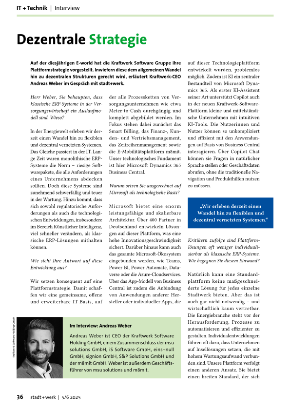 Auf der diesjährigen E-world hat die Kraftwerk Software Gruppe ihr Plattformstrategie vorgestellt. Inwiefern diese dem allgemeinen Wandel hin zu dezentralen Strukturen gerecht wird, erläutert Kraftwerk-CEO Andreas Weber im Gespräch mit stadt+werk.