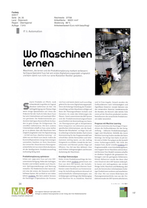 Während viele Unternehmen noch keinen Plan für Industrie 4.0 haben, hat der Spritzguss-Spezialist Fuso sein erstes Digitalisierungsprojekt umgesetzt. Mit Unterstützung von insideAx wurde ein Machine-Learning-Vorhersagemodell realisiert, das die Produktionsplanung markant verbessert.